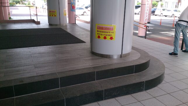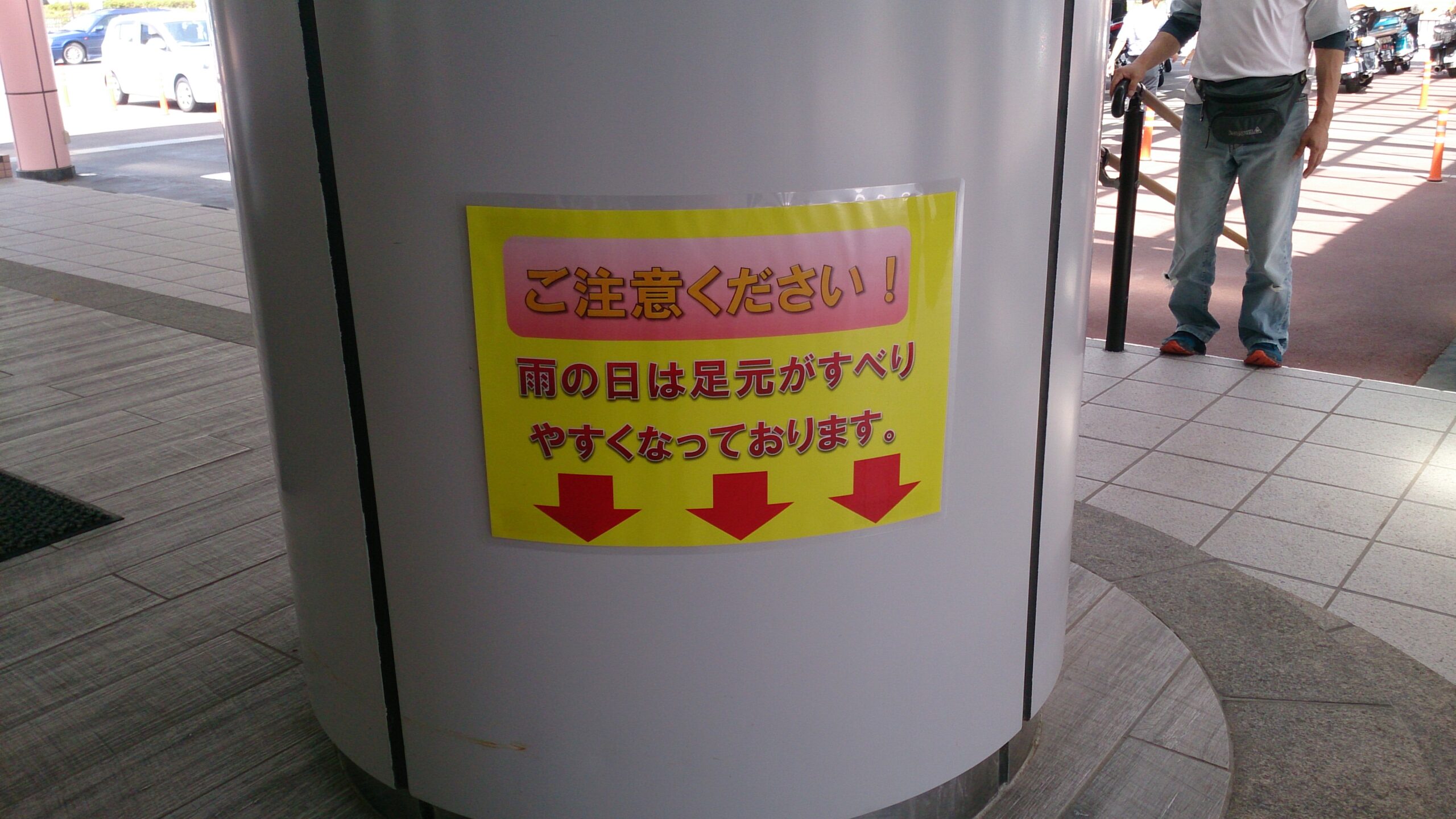 「弊所の床材は滑りにくい加工(もしくは床材に)しておりますが、雨の日は足元にご注意願います。」