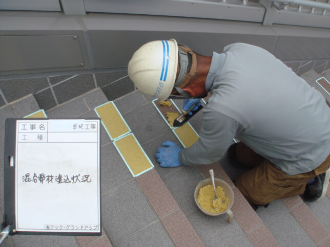 北信太駅自由通路の磁器タイル階段段鼻に、スリップレイト∑(シグマ)03で視覚障害者【色覚障害、弱視(ロービジョン)】や高齢者の方に優しい段鼻認識性向上滑り止め加工(SR工法)を行ないました。
