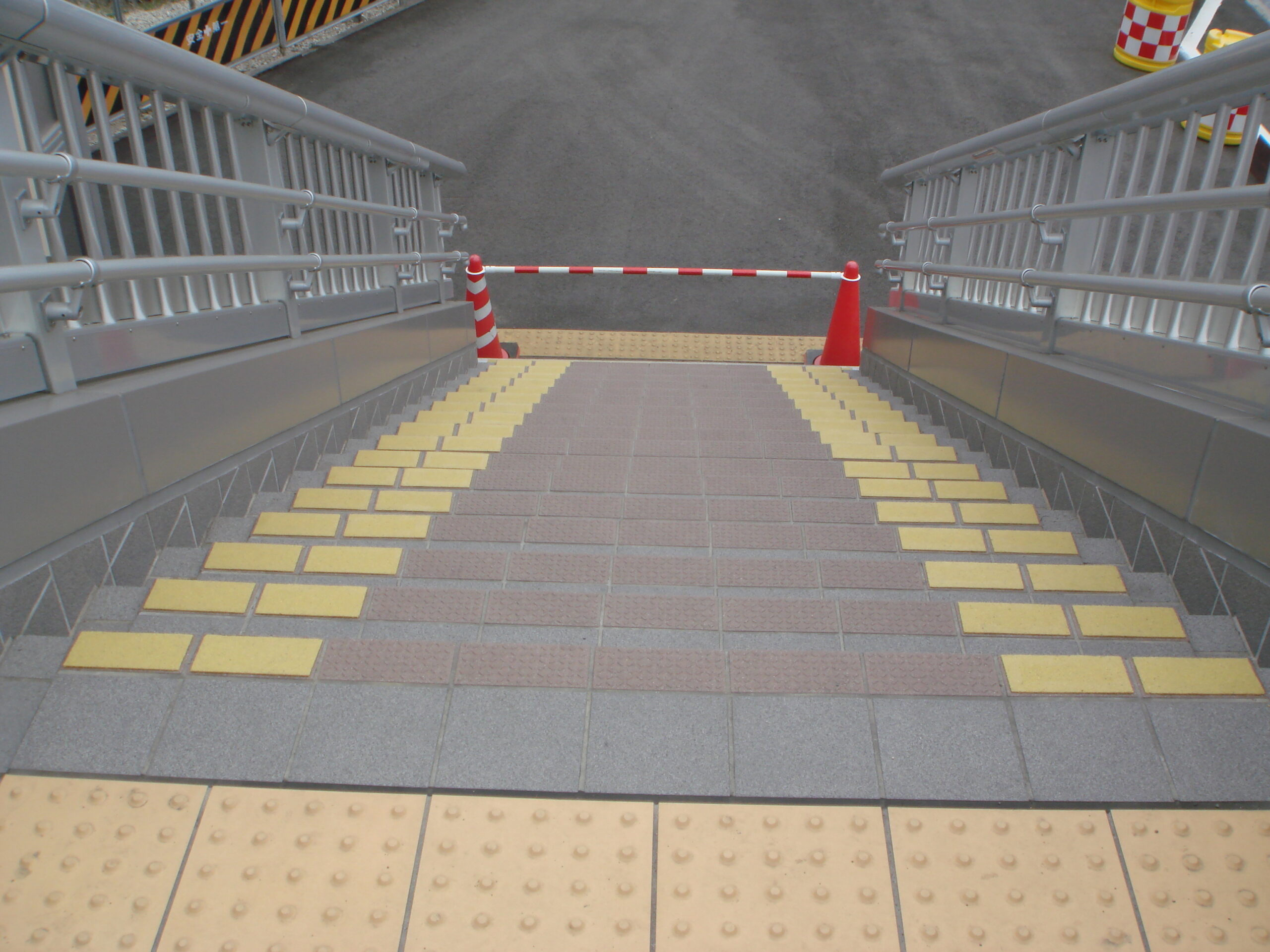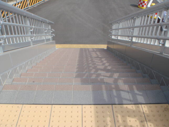 階段踏面は薄いグレーで段鼻が薄いエンジ色と、やや輝度比の低い現況に対し、段鼻に黄色の骨材を使用して輝度比を上げ、視覚障害者【色覚障害、弱視(ロービジョン)】や高齢者の方はもちろん健常者にとっても段鼻認識性が向上し、階段段鼻鼻先が解りやすくなりました。